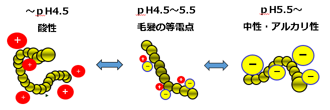 つまり、髪の毛はpH 4.5~pH 5.5だとプラスとマイナスの電荷が等しくなるんです。