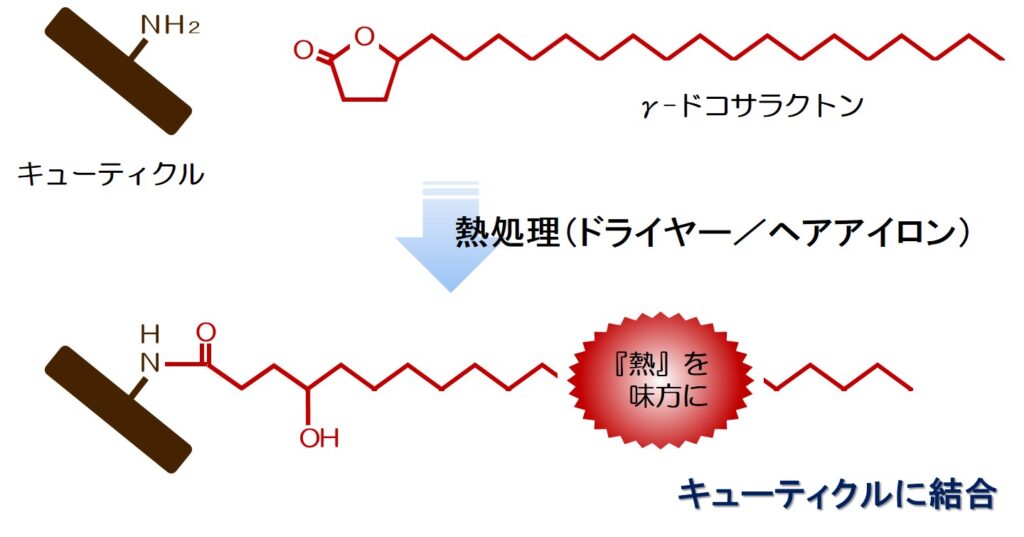 ドコサラクトンの最大の特徴は、ラクトン環とよばれる五角形の分子内エステル構造を持ち、ドライヤーやヘアアイロンなどの熱により、キューティクルのタンパク質(アミノ酸)と反応し、結合して補修する熱応答性の補修成分。