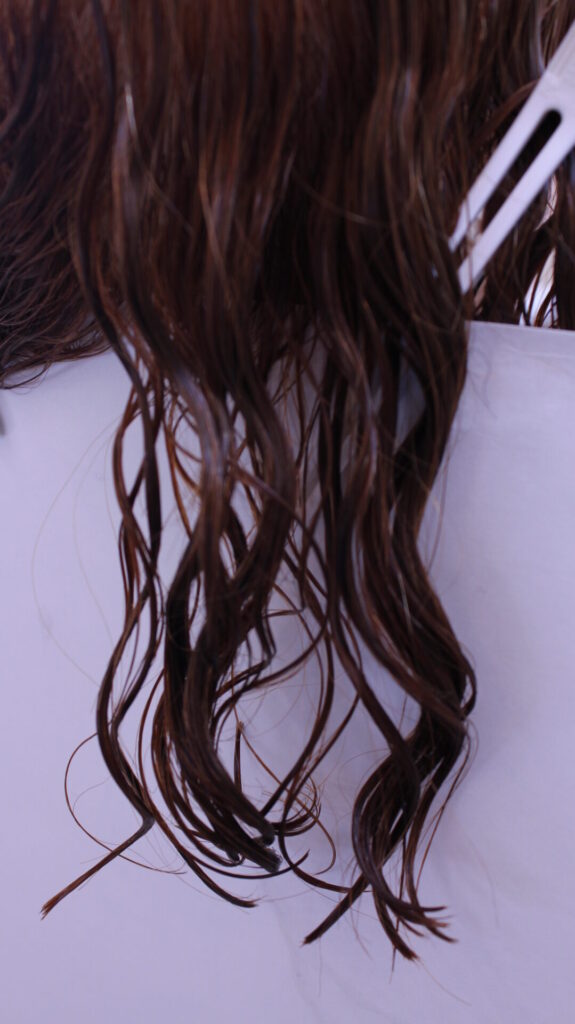 かかりの安定やダメージを作らない点が難しいと考えられているつけデジ技法で、リケラプラス リノベーターローションを使用し、パーマのかかりとダメージが少なくなる適温を探る。